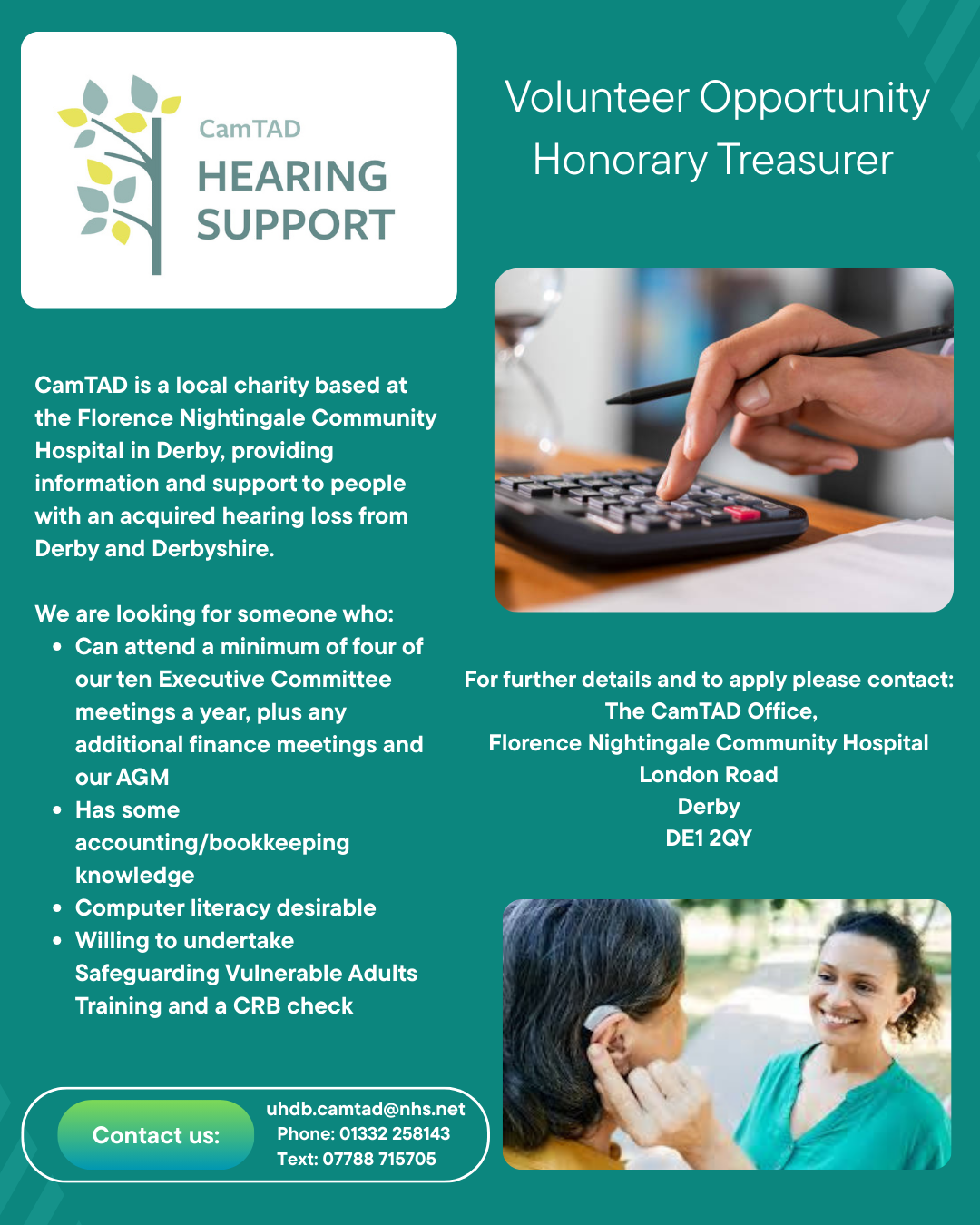 These are volunteer posts so if you have a couple of hours a month to spare, and would like to help us guide this long established local Derby charity, please contact us via the office email: uhdb.camtad@nhs.net and we will get back to you with more information.